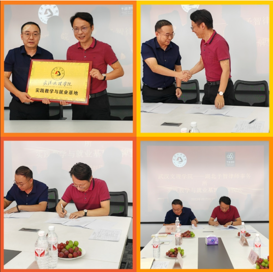 2023年5月25日上午10时,武汉文理学院政法学院教学院长:李蔚、教学副院长:陈海峰,法学系主任:罗平,副主任:吴蕾,教研室主任:江莲与我所主任律师全星、合伙人严昌龙、合伙人张昭,青年律师张辰銘成功举行了签约暨授牌仪式。