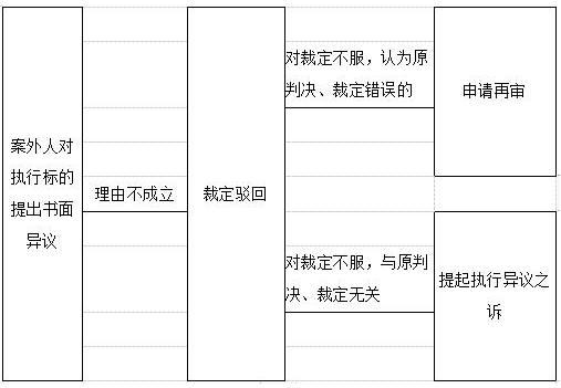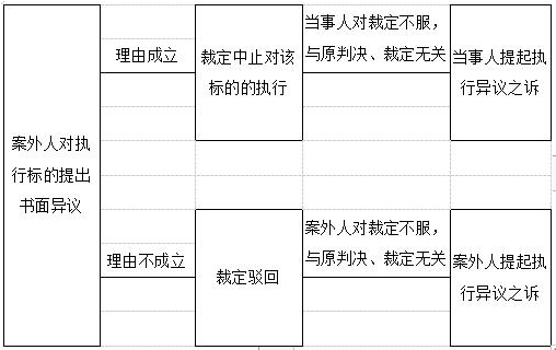 《民事诉讼法》第二百三十四条规定:“执行过程中,案外人对执行标的提出书面异议的,人民法院应当自收到书面异议之日起十五日内审查,理由成立的,裁定中止对该标的的执行;理由不成立的,裁定驳回。案外人、当事人对裁定不服,认为原判决、裁定错误的,依照审判监督程序办理;与原判决、裁定无关的,可以自裁定送达之日起十五日内向人民法院提起诉讼。”笔者根据该规定制作案外人执行异议之诉的流程图大致如下:
