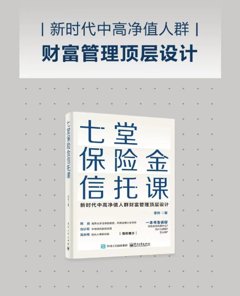 首先介绍一下这本书,《七堂保险金信托课》是一本电子工业出版社出版的图书,作者是李升,主要讲述了保险金信托的相关知识。从信托简史、信托基础、集合资金信托计划、家族信托、保险金信托、保险金信托实操案例、实务问答七个角度,全面讲解保险金信托这一新型财富管理工具。