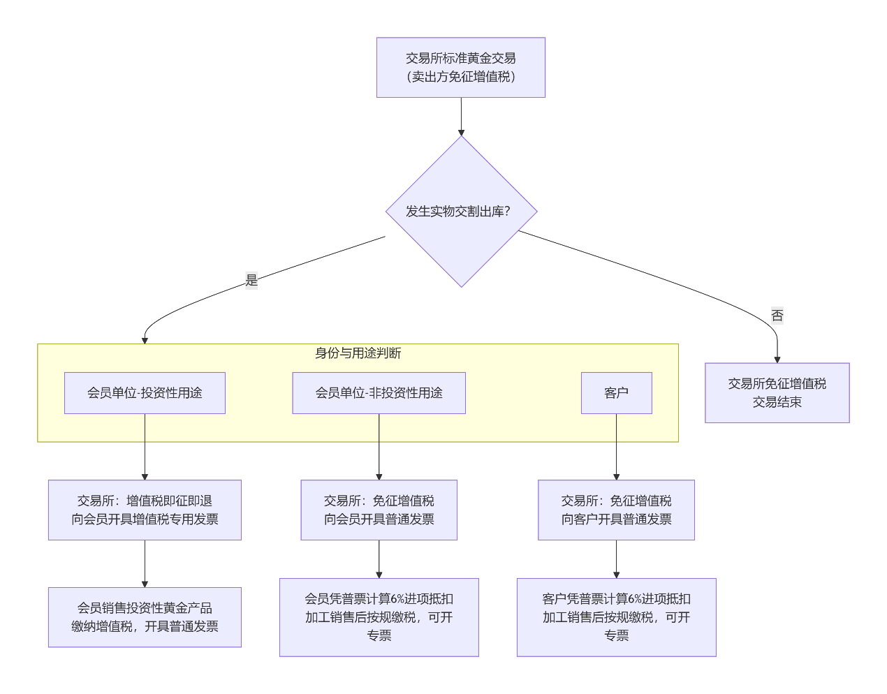 新政要求会员单位在黄金实物交割出库前,必须完成 “用途申报 - 发票匹配” 流程:投资性黄金开具增值税专用发票,非投资性黄金开具普通发票;若需变更用途(如投资性转非投资性),需提前向交易所报备,通过红字发票冲销原票后重新开具。